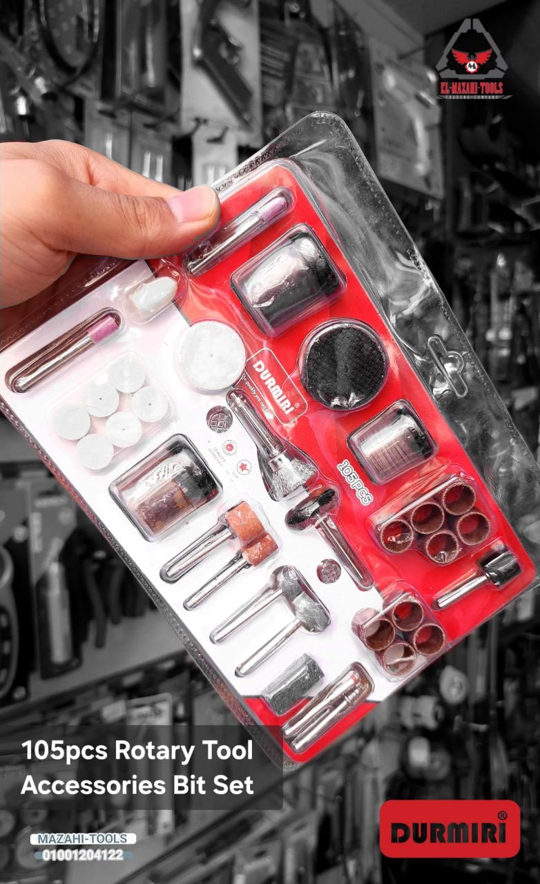 تتضمن المجموعة 105 قطعة مزيجًا من أدوات التلميع، والوسادات، وأقراص القطع، والأسطوانات، وقطع الطحن، والأقراص، وبتات النحت وقطع التنظيف وما إلى ذلك.