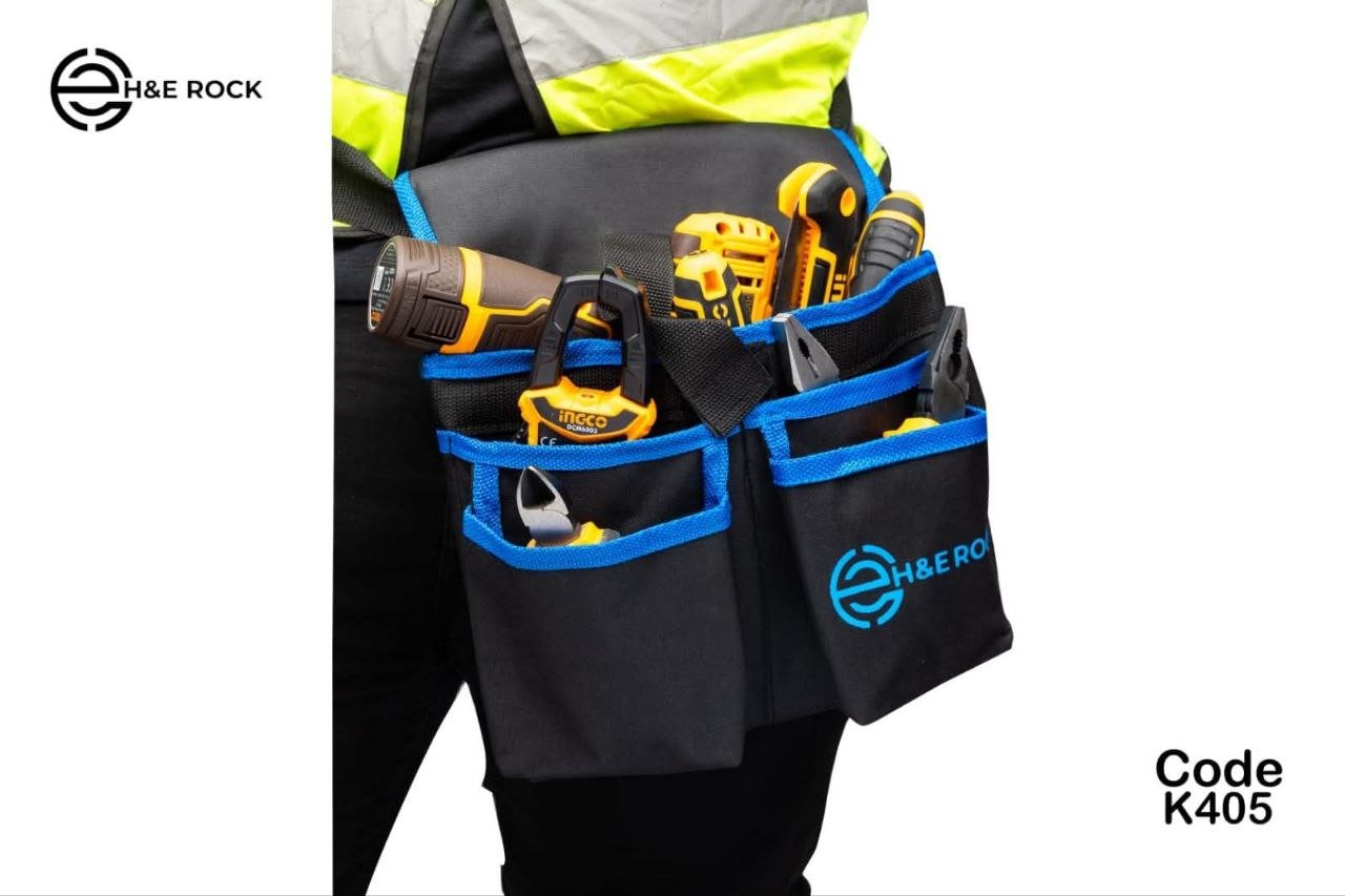 حزام متعدد الاغراض وسط وكروس مبطن من H&E ROCK Code: K405 Tool Belt for Multi Purpose حزام حمل ادوات متعدد بجودة عالية جيب كبير علوي مقاس 30*20*4 سم 2 جيب مقاس 16*13 سم 2 جيب منتفخ 12*12 سم مساعد ممتاز أثناء العمل لإنجاز المهام بأقل مجهوء