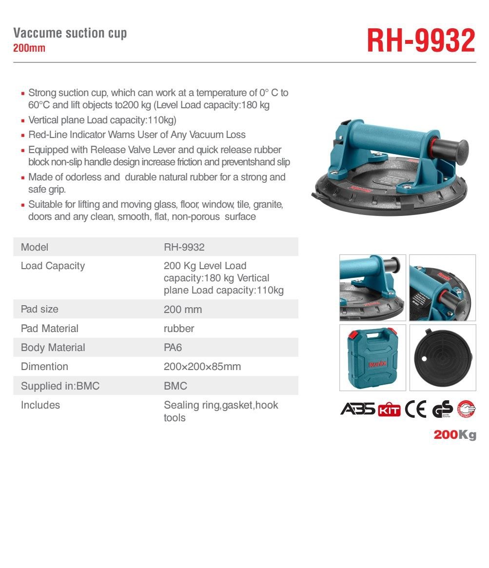 كوب شفط قوي، يعمل في درجات حرارة تتراوح بين 0 و60 درجة مئوية، ويرفع أجسامًا تصل إلى 200 كجم (سعة التحميل المستوية: 180 كجم