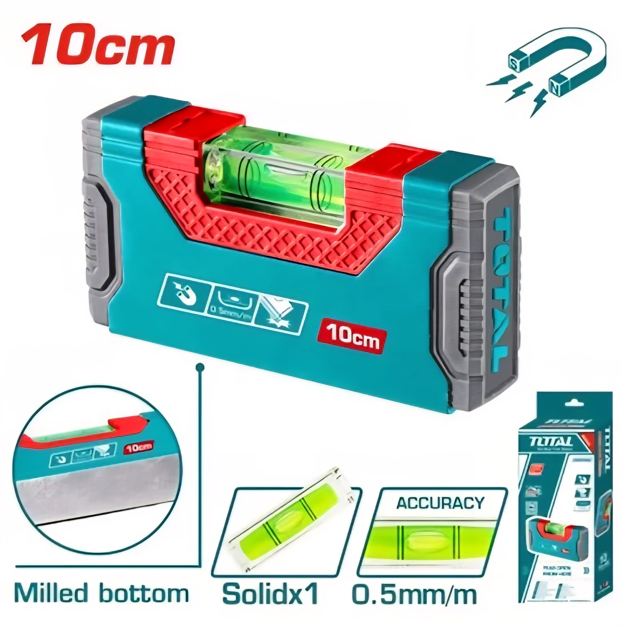 Code: TMT205101 HAND LEVEL 10cm الطول: 10 سم مع مغناطيس قوي 0.5 مم / معامل خطأ وسائد طرية مقاومة للصدمات مع بدن ثقيل وقوي الابعاد 10×5×2 سم