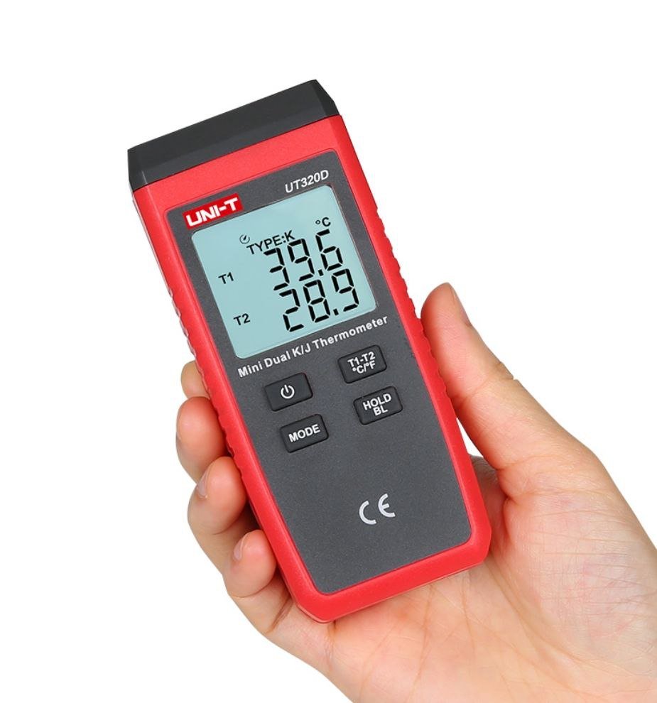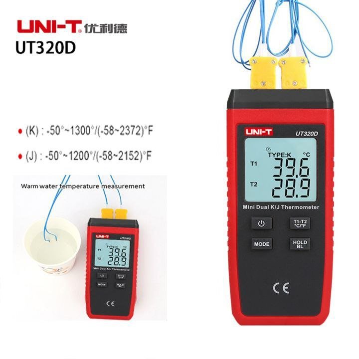 مقاييس حرارة تلامسية أحادية القناة ومزدوجة القناة على التوالي. تتميز هذه المقاييس عالية الدقة بنطاق واسع لدرجات الحرارة. كما يُمكن لجهاز UT320D حساب فرق درجة الحرارة بين قناتيْه.