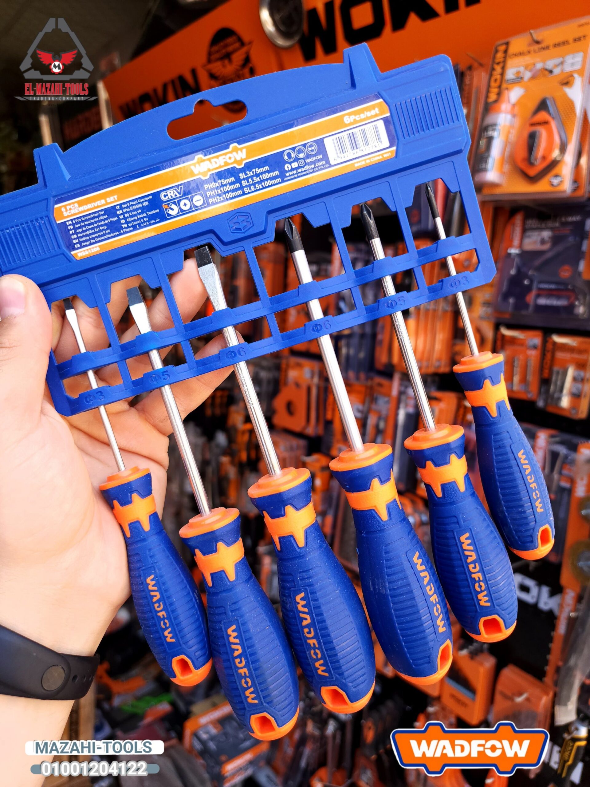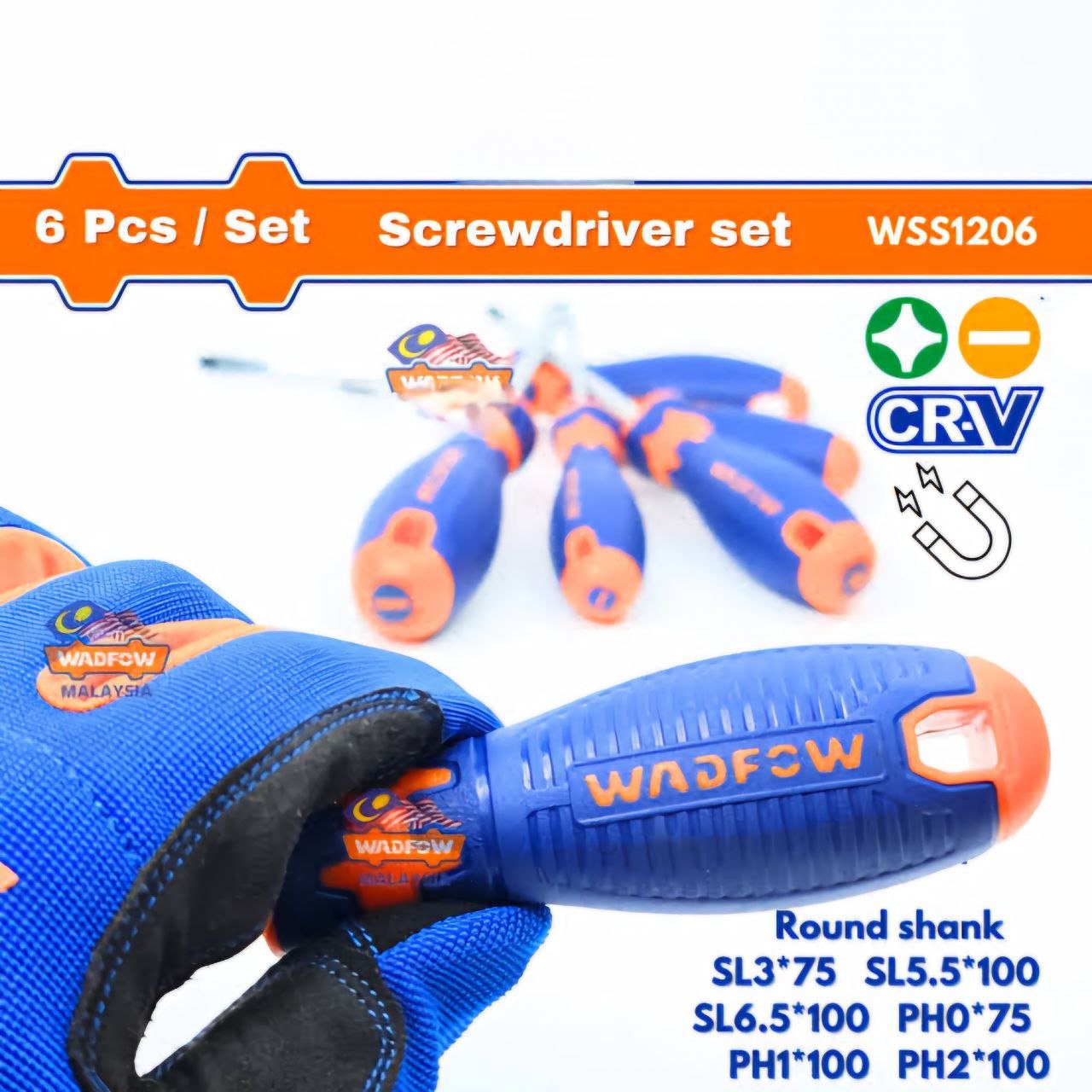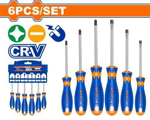طقم مفك 6 ق يد كاوتش من WADFOW Code: WSS1206 6 Pcs screwdriver set طقم مفكات براغي من ٦ قطع المادة: ساق CR-V دائرية SL3*75، SL5.5*100 SL6.5*100، PH0*75 PH1*100، PH2*100 مغلف بحامل بلاستيكي